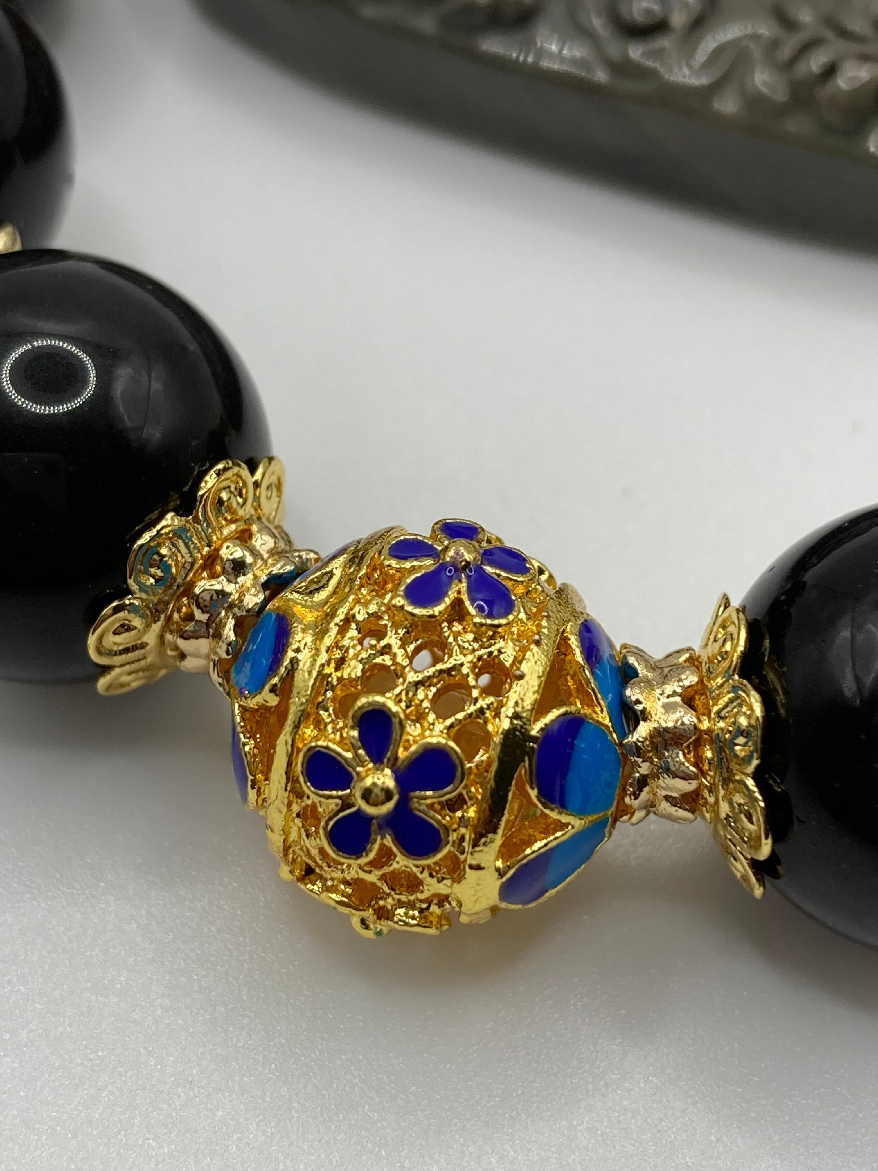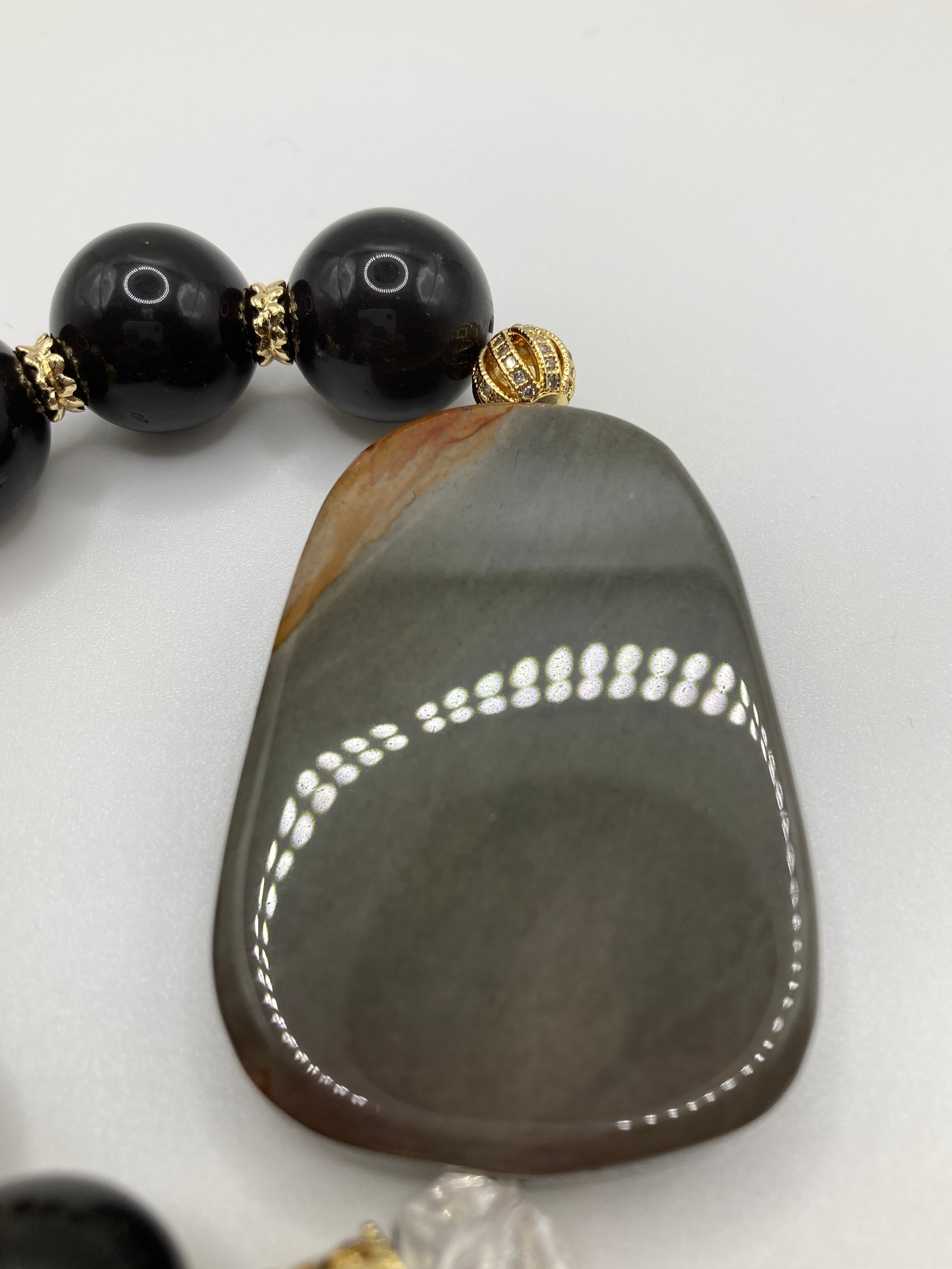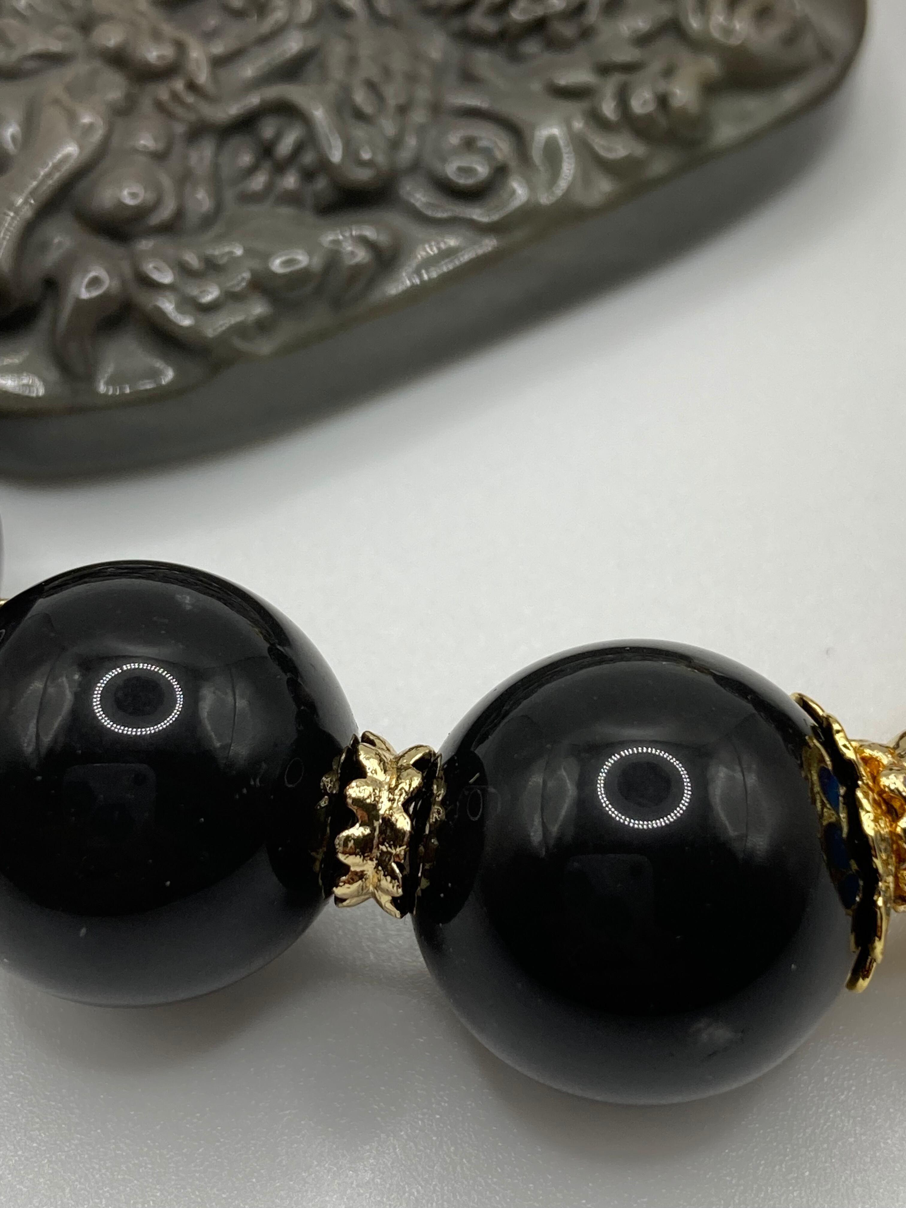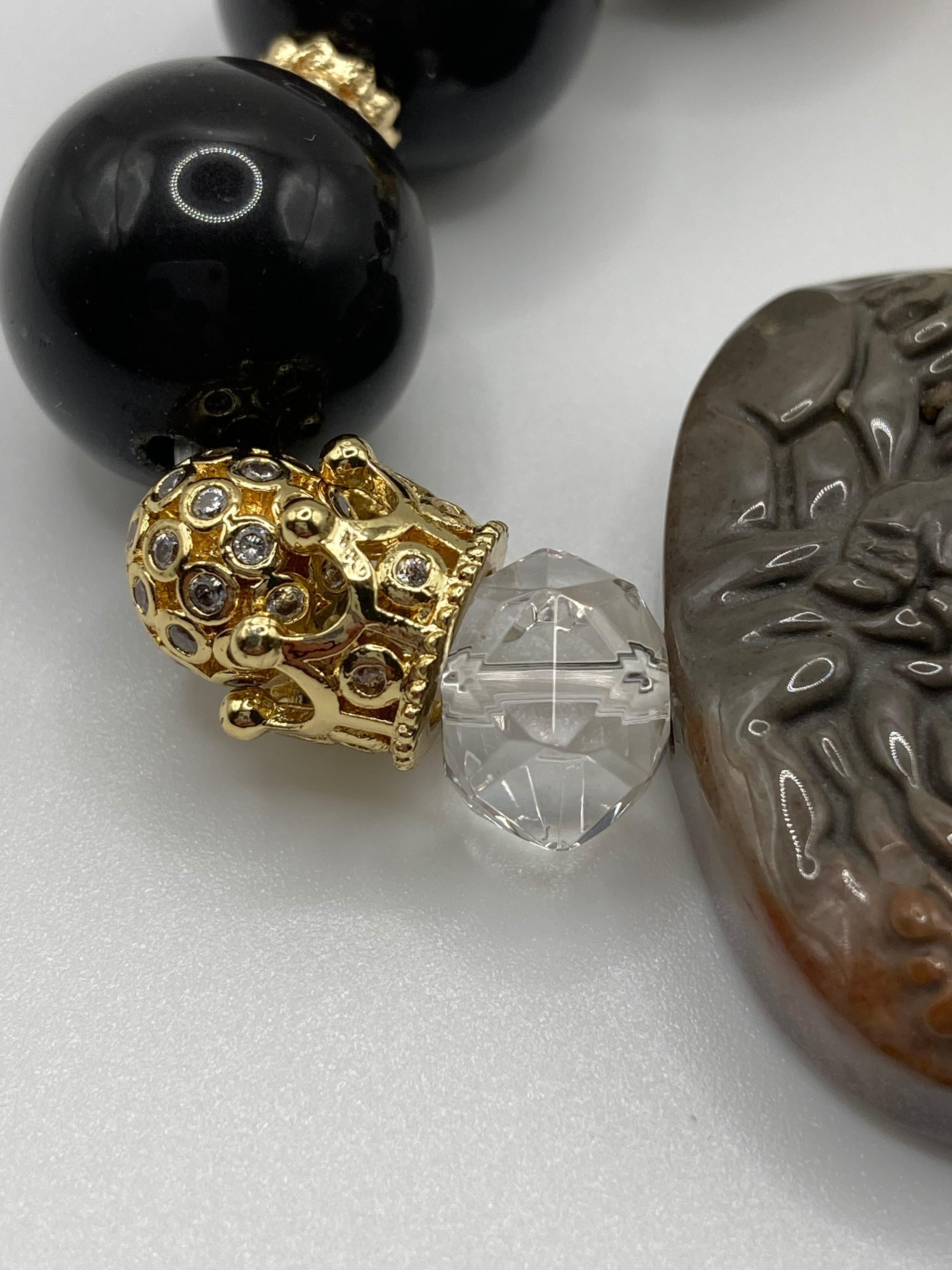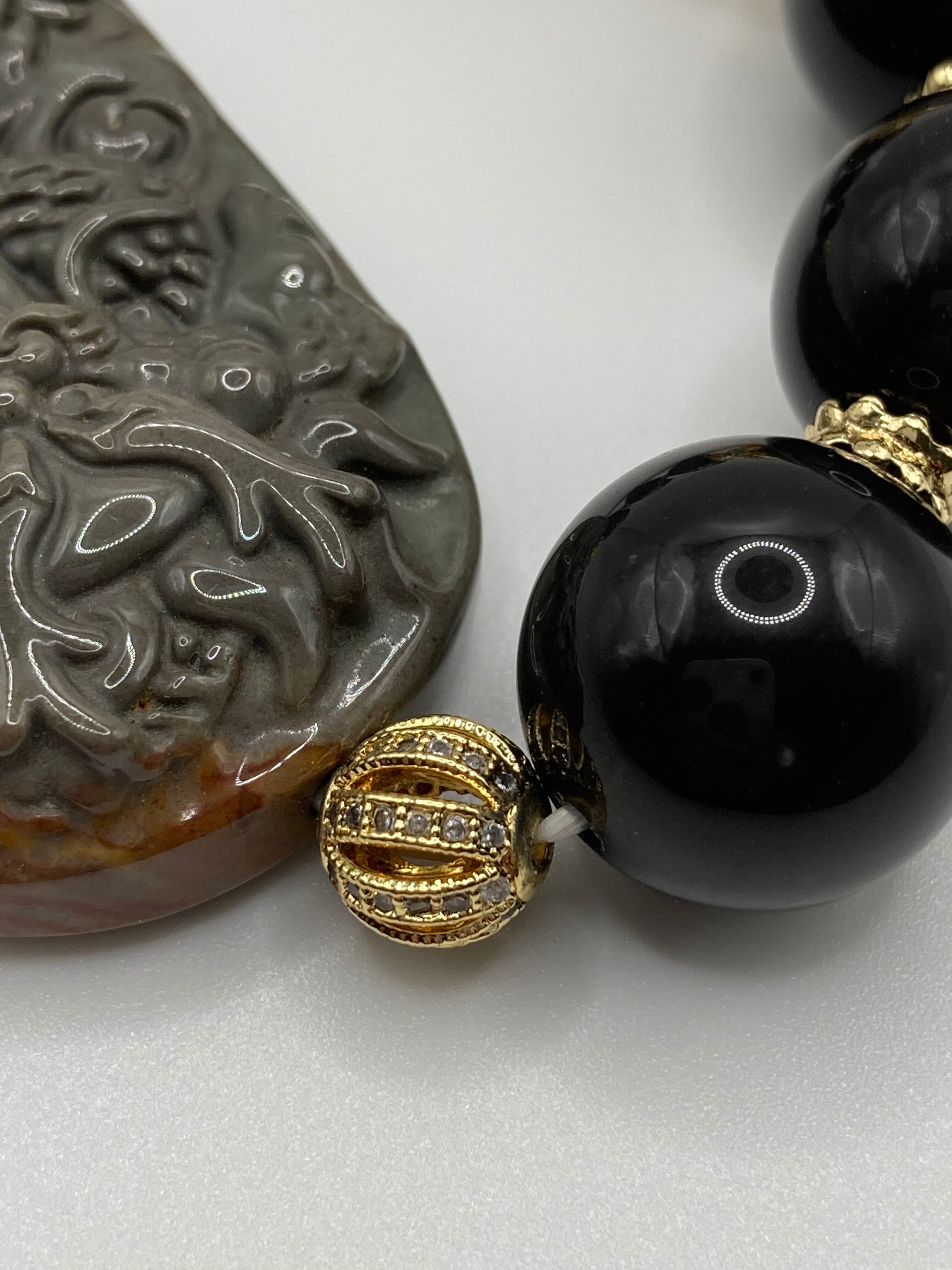 天然のシルバーオブシディアンにアラシャン龍彫をあしらったデザインブレスです。サイズはシルバーオブシディアン13mm、アラシャン龍約48mm×32mmとなっております。